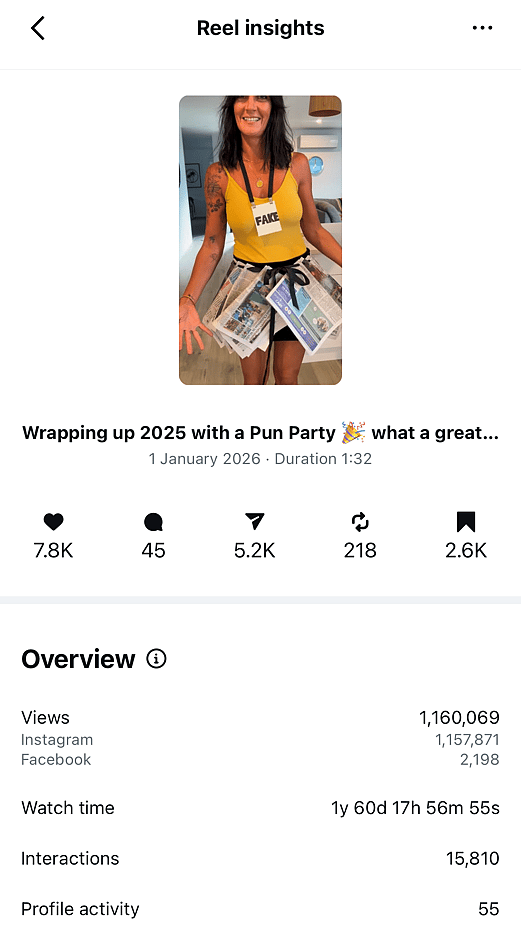 In this case, if the reel had included a simple call to action such as “Comment PUN to receive the Pun Party Idea Guide” then even a tiny percentage of those viewers could have converted into downloads.